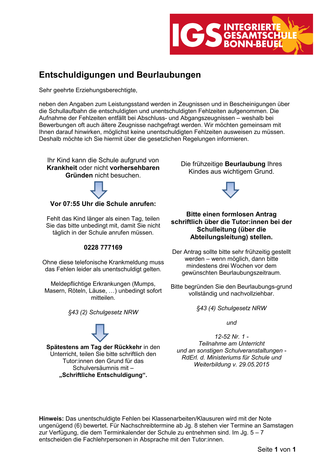 Sie sind hier: Integrierte Gesamtschule Bonn-Beuel » Für Eltern » Verfahren bei Krankmeldungen oder Beurlaubungen