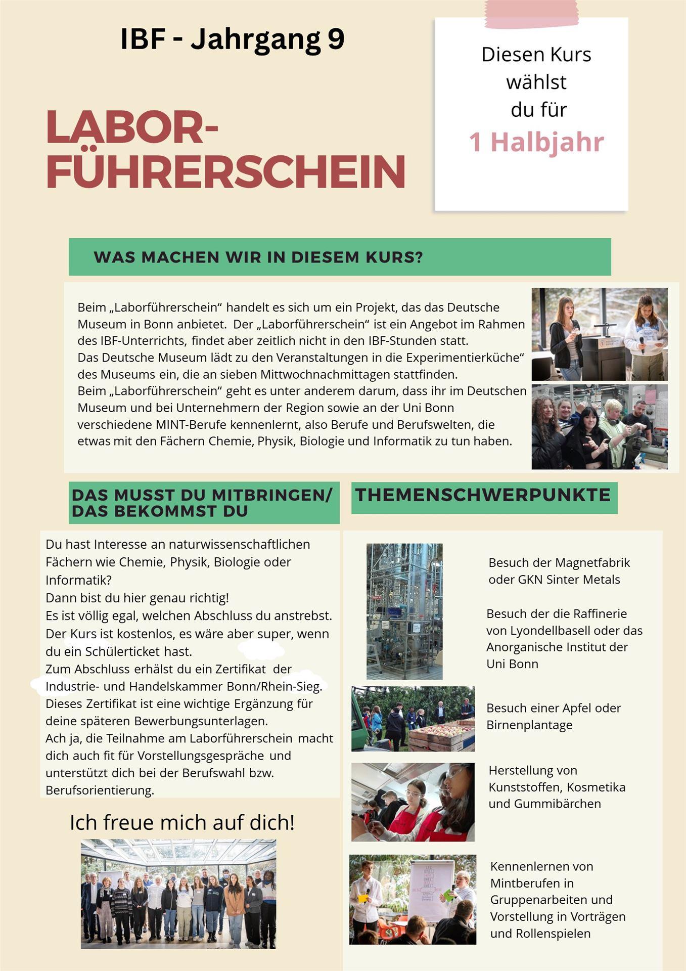 Der „Laborführerschein“ ist ein Angebot im Rahmen des IBF-Unterrichts, findet aber zeitlich nicht in den IBF-Stunden statt. Das Deutsche Museum lädt zu den Veranstaltungen in die „Experimentierküche“ des Museums ein, die an sieben Mittwochnachmittagen stattfinden. Im 2. Halbjahr eines Schuljahres wählt Ihr dann wieder ein neues IBF-Fach.